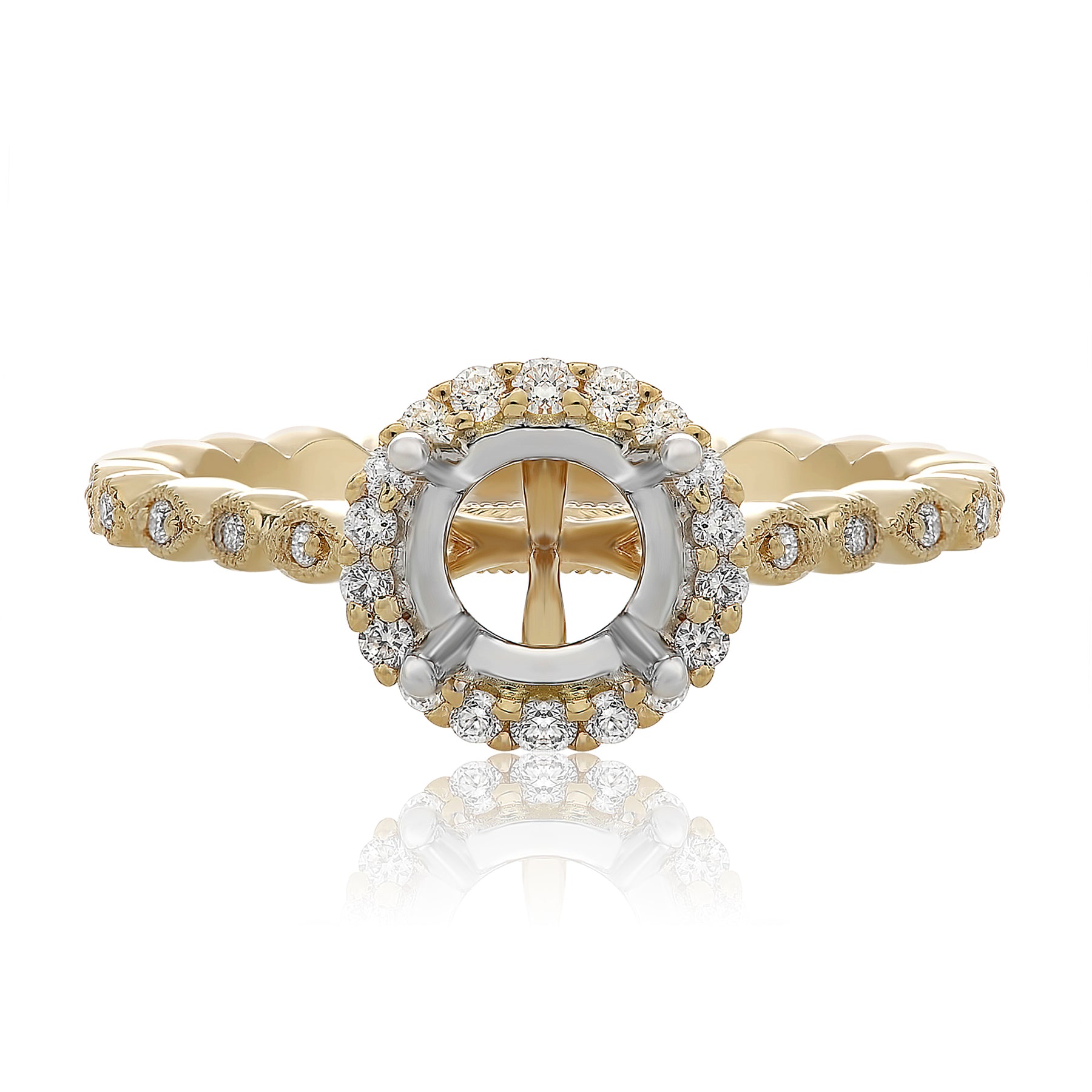 FINAL SALE - 14k yellow gold semi set diamond engagement ring = filigree style band with millgrain edges - halo center 28= .15tdw, holds 5.8mm center.