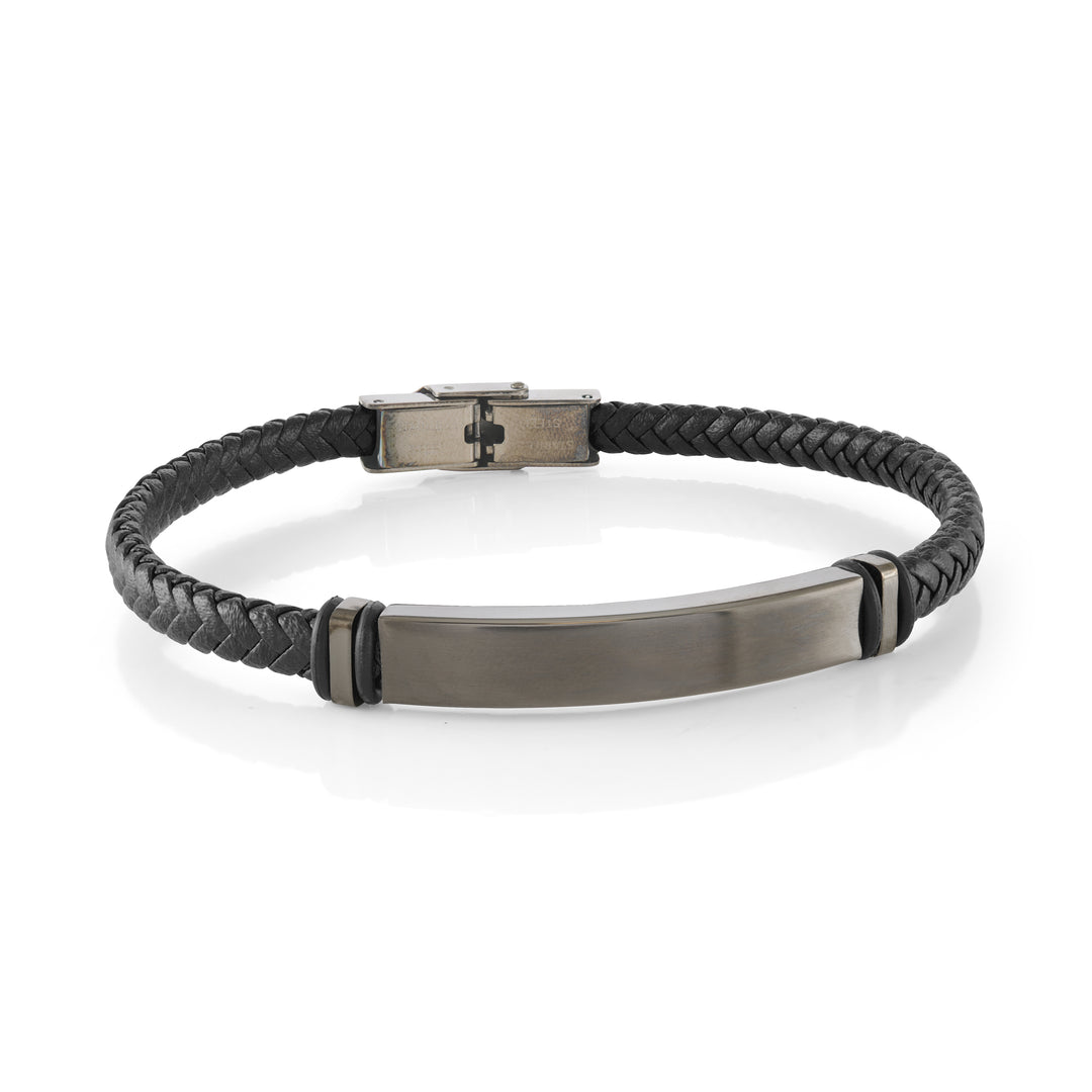 Italgem Steel Black Braided Leather Bracelet with Engraved Front Plate
