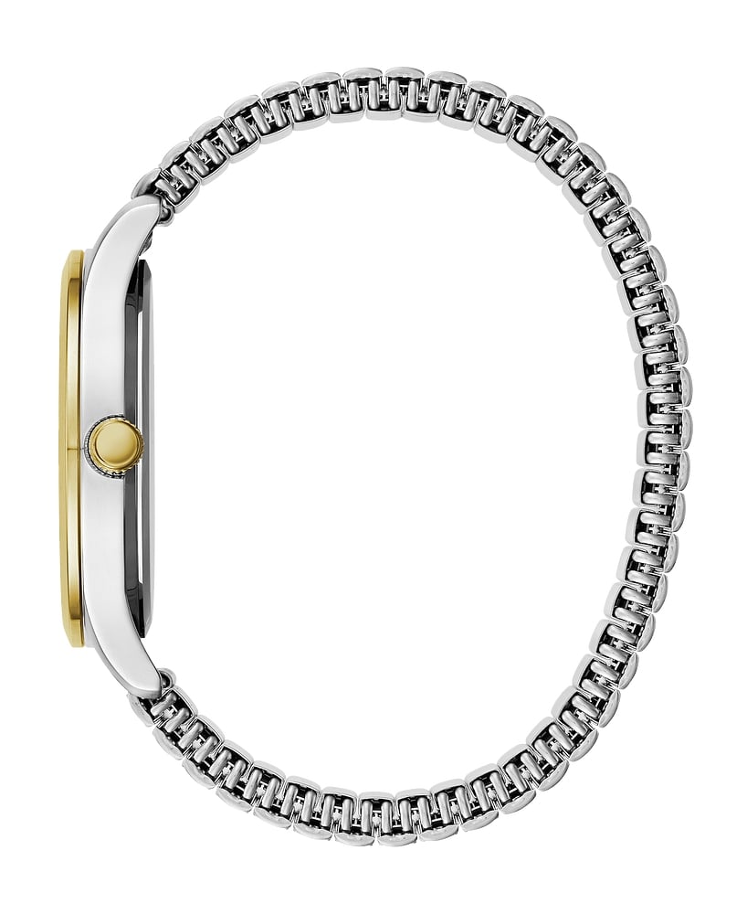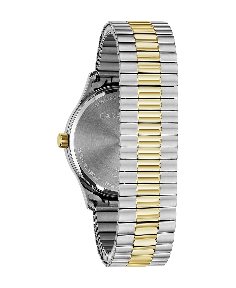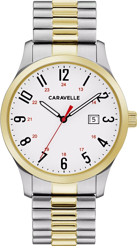 Caravelle by Bulova Traditional Watch - Timeless design, wear-with-everything style. Complete with easy-to-read bold 24-hour design and three-hand date feature on matte white dial. Gold-tone accented stainless steel case and comfort-fit expansion bracelet are the finishing touches on this classic watch.